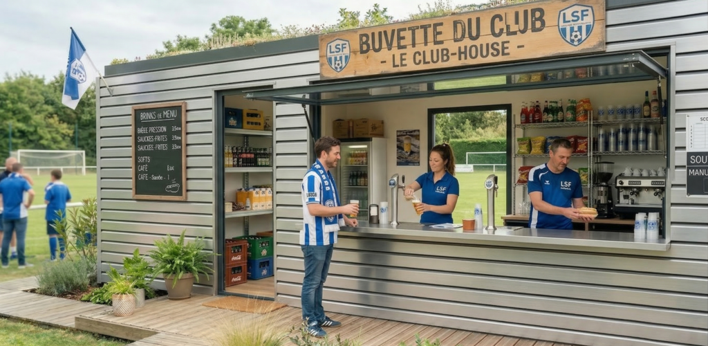 Une buvette au design brut et authentique. Son ouverture horizontale transforme le module en un comptoir convivial, idéal pour l’accueil et le service lors des événements sportifs.